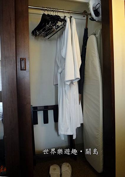 走道口轉角處是衣櫥,衣櫥裡〜保險箱、熨斗、燙衣板、浴袍、室內鞋…等一應俱全。