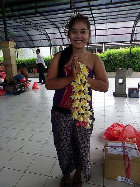 一到機場入境大廳,當地的導遊已穿著藍色花花上衣迎接我們。出機場大門,隨即被身穿印尼傳統服裝的美少女套上雞蛋花圈,淡淡的花香伴著愉悅的心情,踩著輕鬆的步伐~開始五天四夜的峇里島之旅