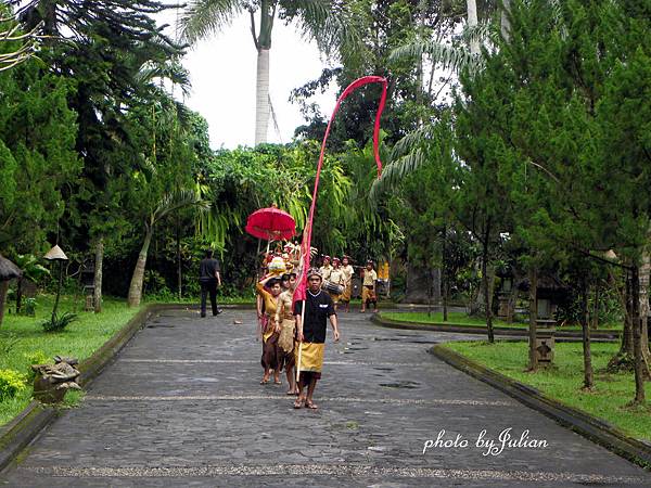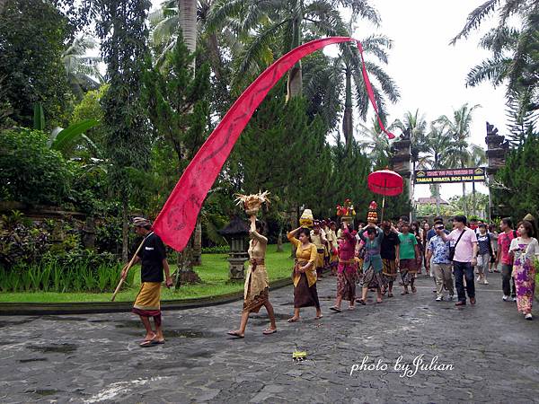 抵達BCC峇里文化村的「歡喜門」,不久看見村民〜男的敲鑼打鼓,女的頭頂食物列隊走出村子,這是村民依照峇里島習俗迎接賓客到來的迎賓隊伍〜