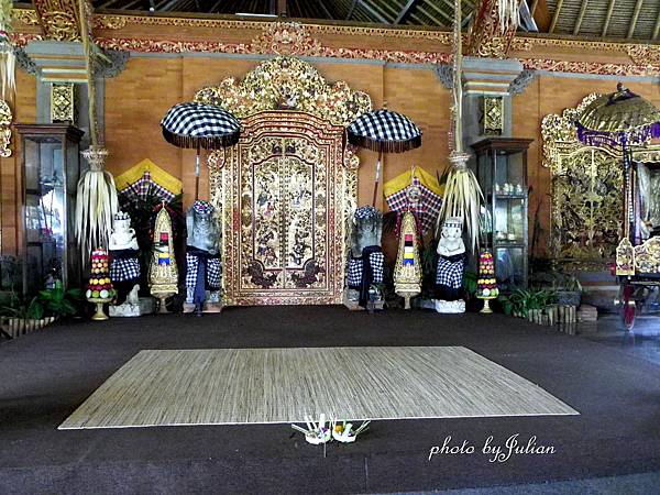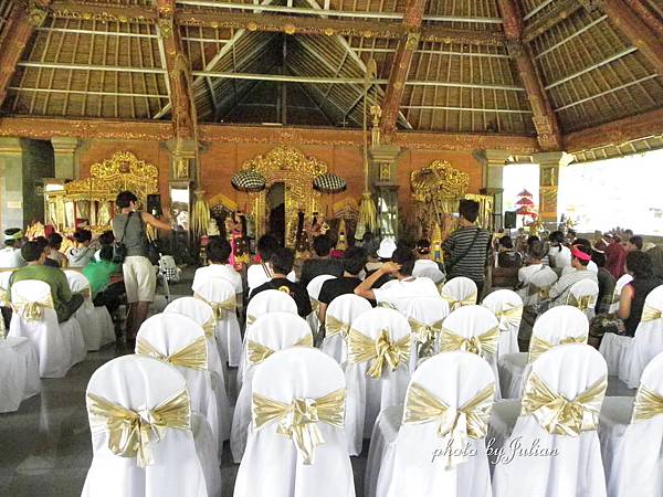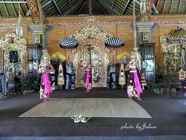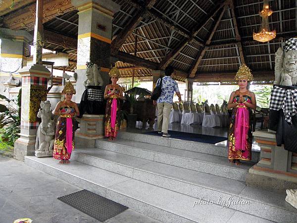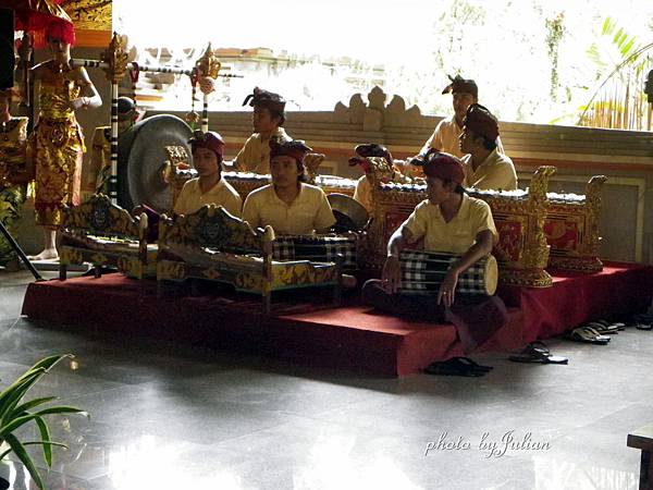 一旁打擊樂器的表演人員已就位,開始叮叮冬冬的敲打起來〜在這裡我們要欣賞峇里島的傳統樂曲和舞蹈表演〜