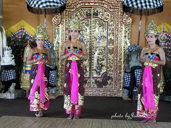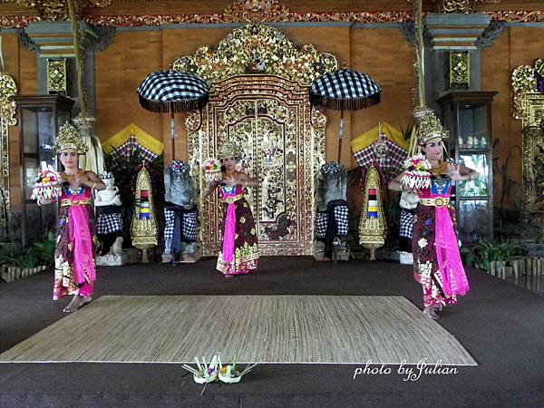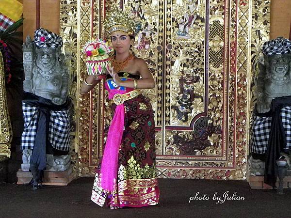 峇里島傳統舞蹈的最大的特色在於誇大流轉的眼神和會跳舞的手指,以及搭配豐富的體態表現,應和著甘美朗音樂(傳統打擊樂)…整個表演長度大約10分鐘。