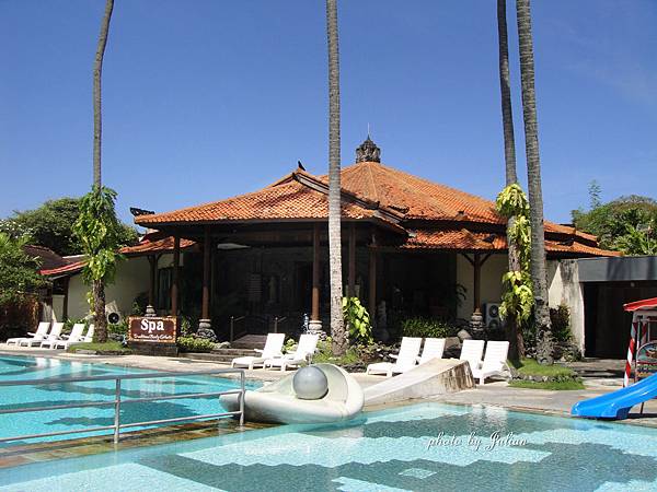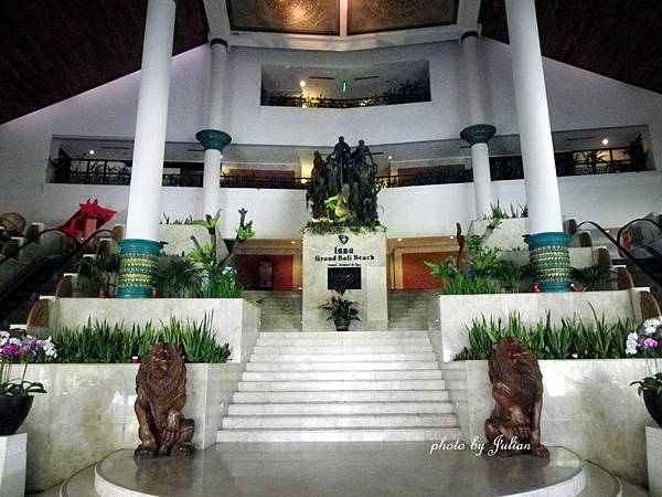 旅行社安排造訪的SPA會館,位在SANUR區的"INNA GRAND BALI BEACH HOTEL RESORT&SPA"這間飯店裡。這是峇里島的第一間五星級飯店,建 於西元1966年,也是峇里島全島最高的一間飯店,因為在飯店蓋好之後,峇里島規定所有建築物不可蓋高於椰子樹,以保有峇里島的特色,直到2001年,45米高的獨立紀念塔小婆羅浮屠落成,成為峇里島最高的建築物。(照片為飯店的挑高大廳)