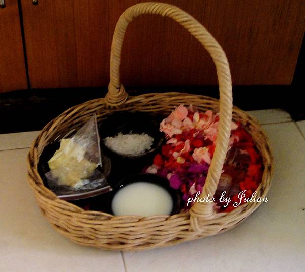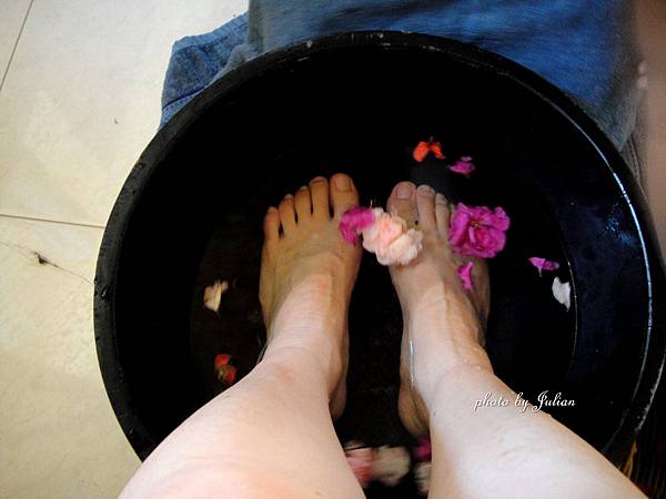 進到芳療室,芳療師先讓雙腳泡在用香精油和著海鹽撒著玫瑰花瓣的水桶裡,泡著泡著…溫柔的來個足部清潔按摩,去除腳ㄚ子的老化角質,並正好消除腳ㄚㄚ這二天的疲勞〜