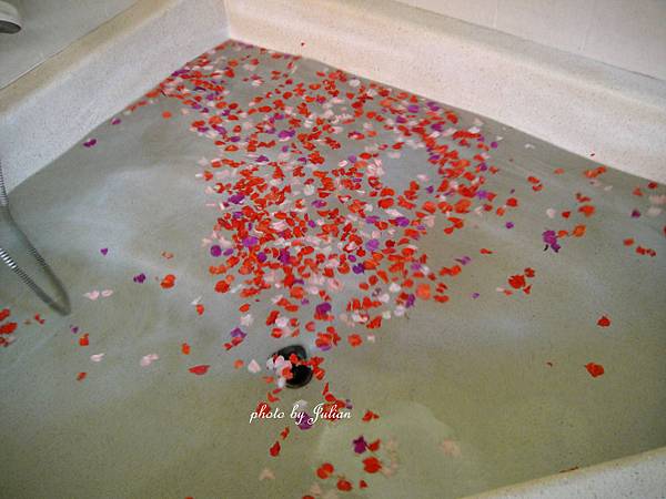 再一次的沖淨身體,浸泡在充滿香精花瓣的浴缸中,享受貴妃公主般的花瓣澡〜。(花瓣只有一些些,不相DM裡滿滿都是…)
