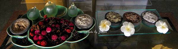 接下來利用特製混合的露露塗抹全身,好像成份有茉莉花油加檀香粉,融合薑、肉桂、肉蔻、細磨米粉等多種天然的植物香料調和成泥狀〜靜敷約 15 分鐘吧〜這期間全身黏糊糊的,之後芳療師就在身上ㄌㄨˋ來ㄌㄨˋ 去…ㄌㄨˋ來ㄌㄨˋ 去…,去除老化黯沉的角質細胞,據說還有排毒、促進血液循環和增加細胞再生的能力!