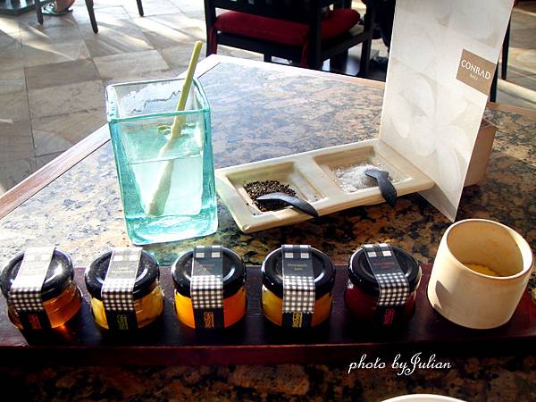 每桌桌上都會放置五小瓶果醬和胡椒、鹽巴。