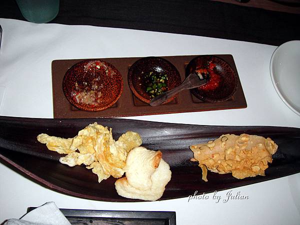 晚餐是義式餐食,但是先送上三種不同口味的蝦餅搭配三種印尼式沾醬。