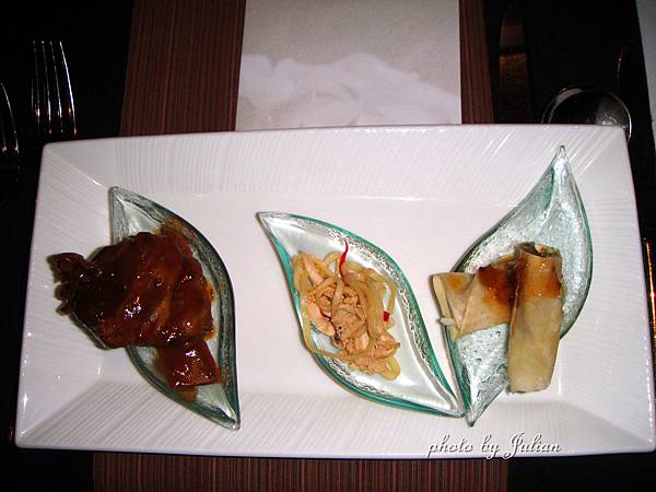 開胃菜是三道精緻小點心,蝦子、雞肉還有春捲。