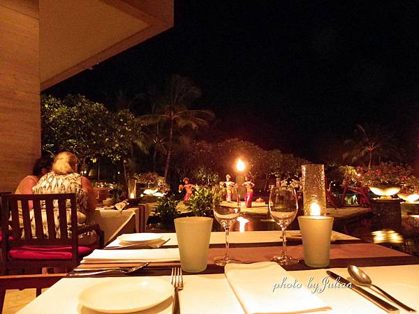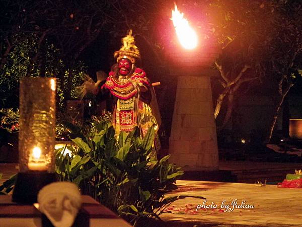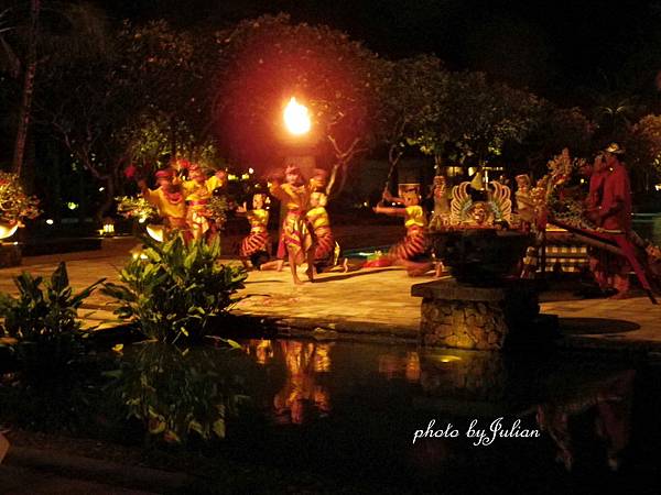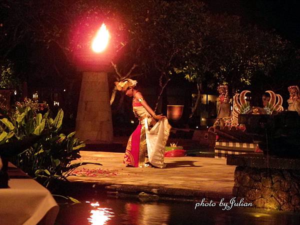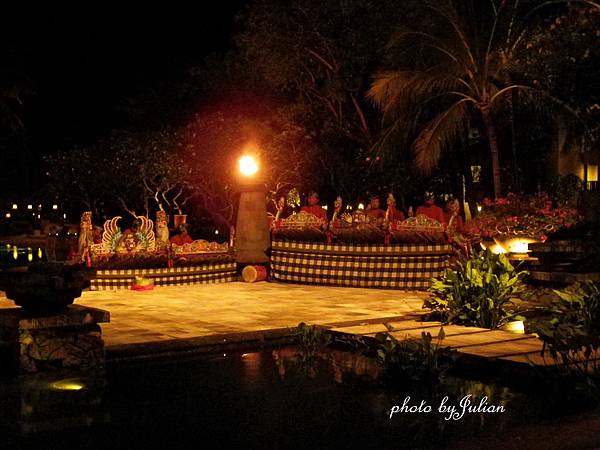 因為夜晚8點,甘美朗的樂音就在池畔平台上敲奏起,峇里島的傳統舞蹈熱烈表演著〜
