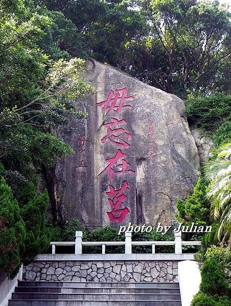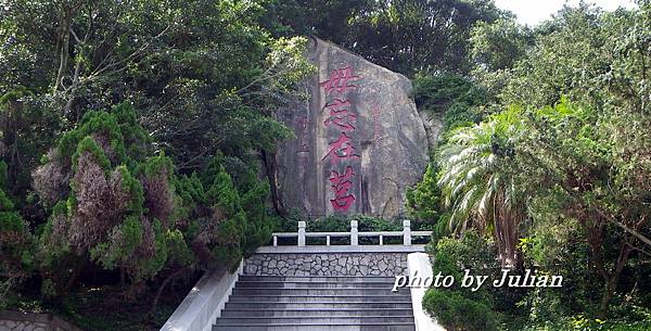 「毋忘在莒」的碑石就是根據 蔣公的墨寶石刻而成的,位在太武山山頂上,高約4丈、寬約2丈,這是到金門一定要合影留念的標誌。