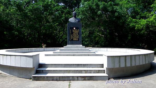 沿著玉章路走了20分鐘,路中央圓環處是劉玉章將軍的紀念銅像。導覽圖上說:劉將軍指揮過823砲戰,領導官兵挖戰壕、鑿地道,開闢太武山登山道路,先總統 蔣公念其功績,於是將太武山公路命名為玉章路。