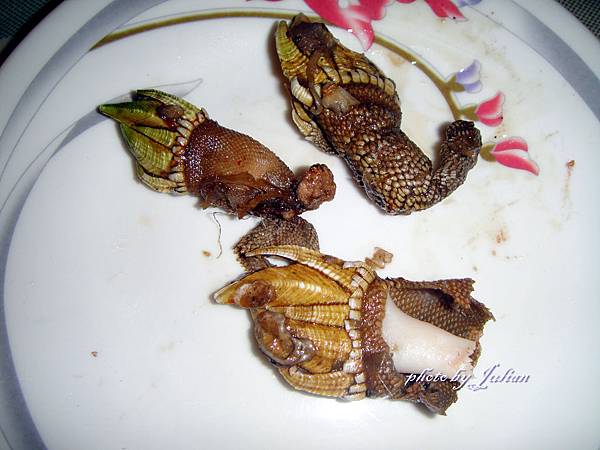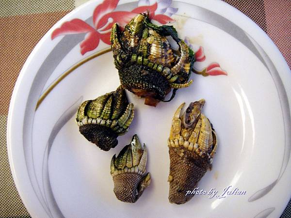 不知該如何下手,請教店家後才知道:咬掉千佛手小手臂上像蛇皮的那層皮,然後吃裡面的白肉;也可以像啃瓜子一樣,對準硬殼喀下去,吸吮裡面的湯汁~滋味鮮甜無比~