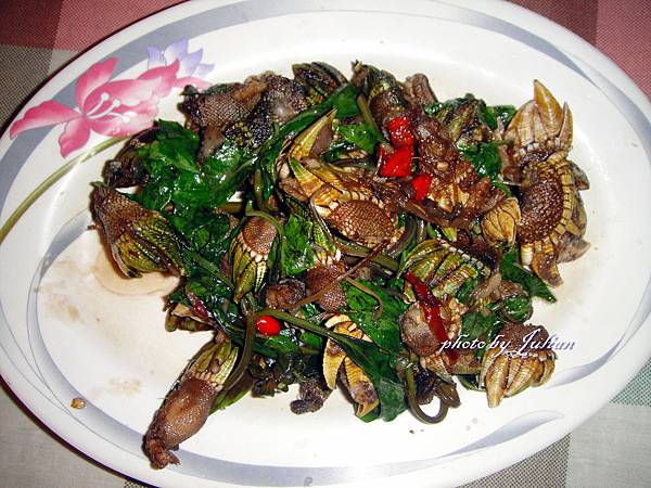 讓人嘖嘖稱奇的千佛手是海岸岩壁上的貝類生物,店家只用九層塔、蒜頭爆香加上醬油炒一下而已!