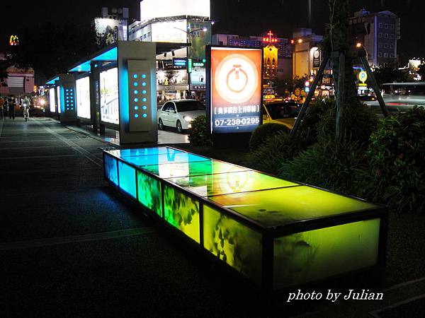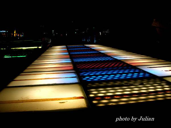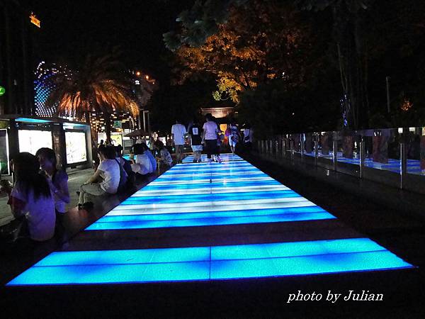 3座藝術玻璃平台在各色跳躍燈光下更添炫麗,行人或坐或站或行走其上,享受燈光街道的浪漫,聽說也是街頭表演者的最愛,不過今晚我沒見著。