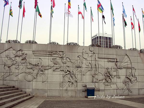 在和平廣場上有座奧運紀念造型物,本體高6.5m,寬3.2m,底座由I.O.C會員國及運動員捐贈約4000塊的萬國石加工砌成,周圍有高2.5m、寬2.4m的5個球體,上面刻著捐贈「世界之石(萬國石)」的I.O.C會員國國名。