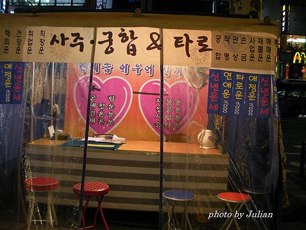 覺得奇怪的是這一攤~這是在算命?還是求姻緣?還是婚姻介紹所?看不懂韓文?!團友笑我少見多怪,其實台灣也有,只是擺設另類不一樣罷了!