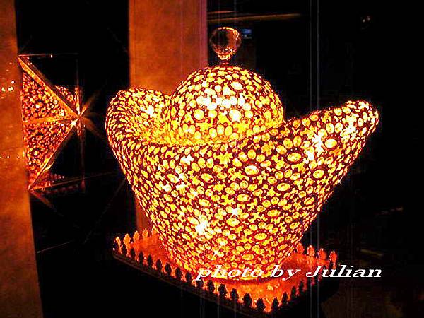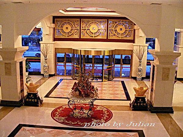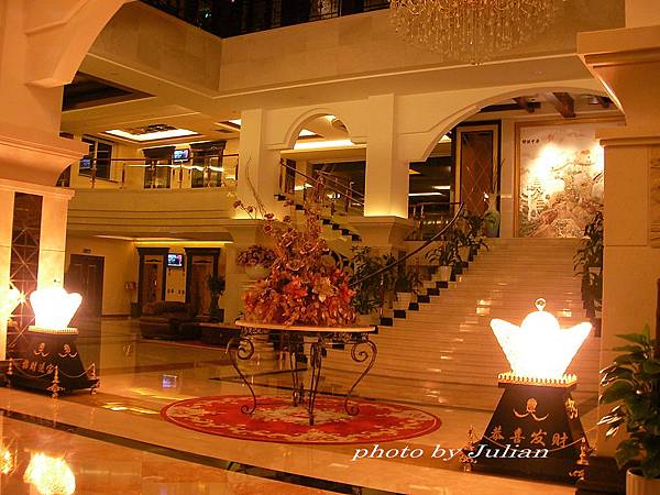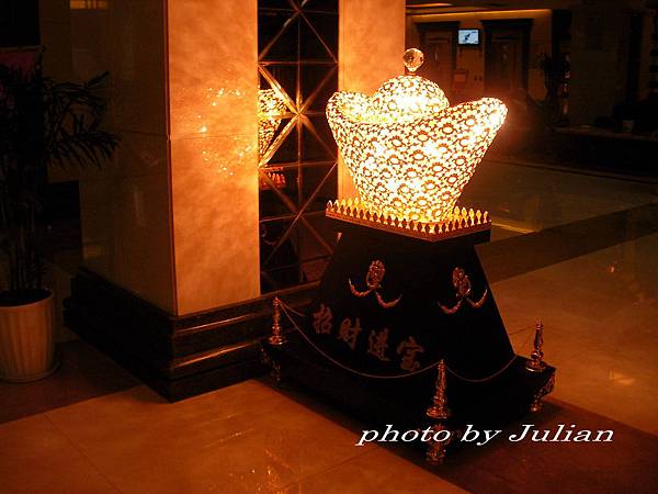 19:00要集合出發去欣賞印象劉三姐。不同剛進門時的風情,飯店大堂的元寶燈亮起了,吸引眾人目光爭相拍照,趁著沒人控檔,我也趕快按下快門。