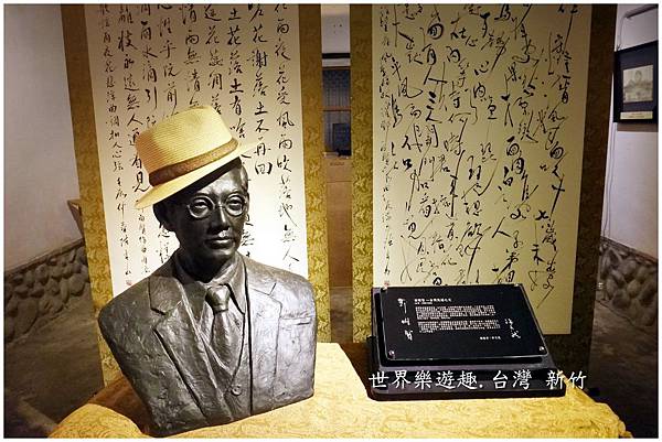 走進「鄧雨賢影音展」的第一間展覽室,吸睛的是知名書法家陳吉山老師墨寶前的俊俏銅像。