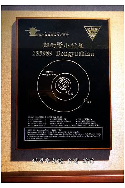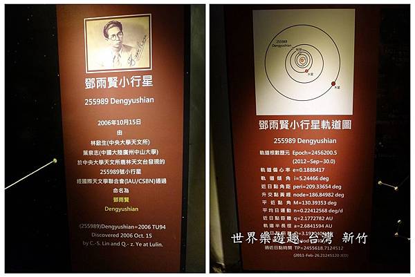 鄧雨賢小行星!?是的,展示資料上說:這顆小行星的發現源自中央大學鹿林巡天計畫(Lulin Sky Survey,簡稱 LUSS),於2006年10月15日由中央大學天文所觀測員林啟生和廣州中山大學葉泉志於鹿林天文台所共同發現。