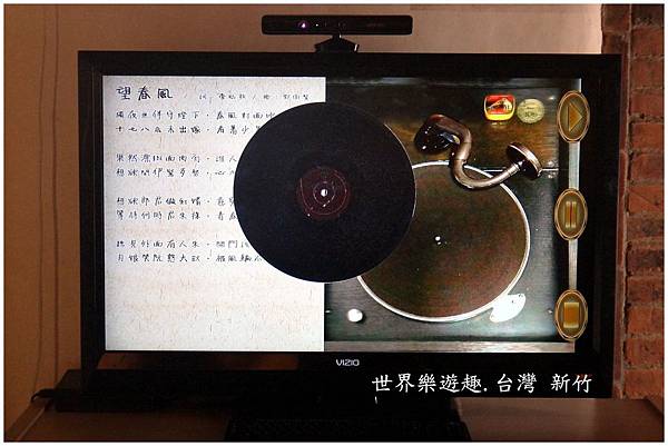 就像玩任天堂的Wii一樣,只要站在電視前的咖啡色腳踏墊上,將手舉起,前方感應器偵測到後,就可以揮動手來操控螢幕上的游標〜