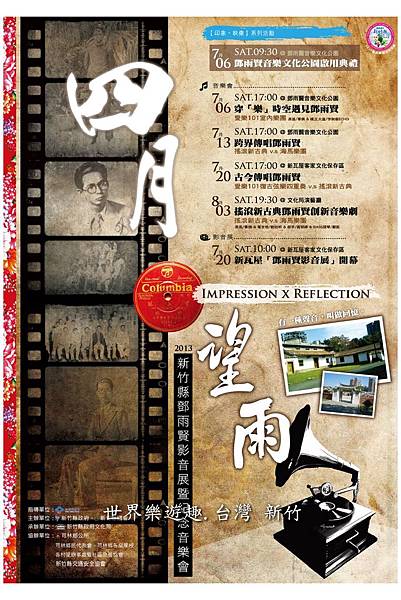 「台灣歌謠之父」影音展在竹北新瓦屋開展了,展場位置在新瓦屋客家建築裡,以「四‧月‧望‧雨」音樂為主軸,使用自然環保建材和LED燈光設計佈置展覽會場,五間的展覽室裡以不同的主題各自呈現,為「鄧雨賢影音館」的籌建揭開序幕〜