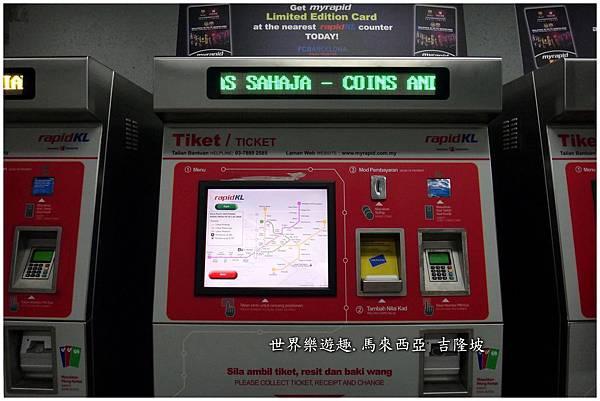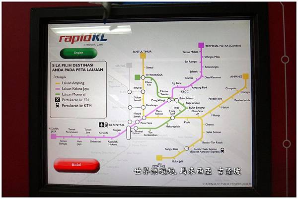 車站裡有自動售票機〜先選擇語言→再來選擇預定到達的車站、人數→最後投入車資,就可以拿到乘車的磁扣了。(Ampang Park→KLCC,車資1人只要馬幣1元)