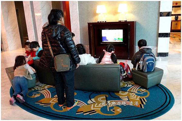 抵達迪士尼好萊塢酒店時正值Check-Out熱門時段,整個Lobby熱鬧異常!在大廳一隅,飯店很貼心地設立小朋友專屬的休息區,不少小朋友就擠在這裡看迪士尼卡通,讓大人可以放心地辦理入住或退房手續,不用擔心小孩滿屋子亂跑。