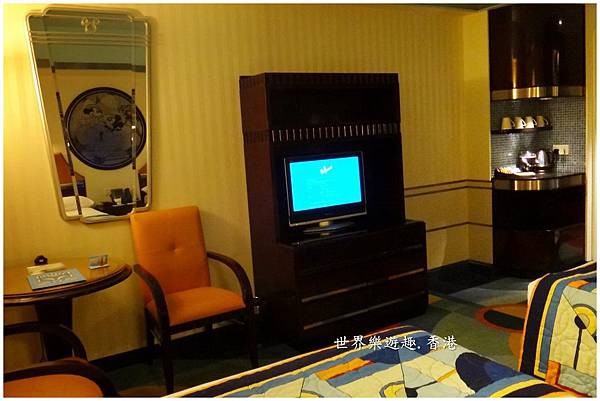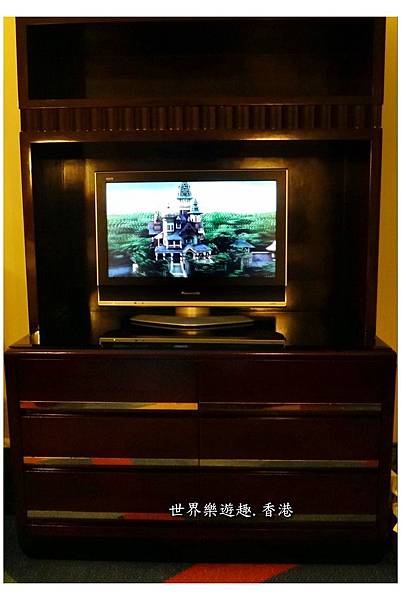 雙人床的床前是電視櫃,最吸引我的除了迪士尼的經典卡通外,還有樂園新主題園區「迷離莊園」的介紹。