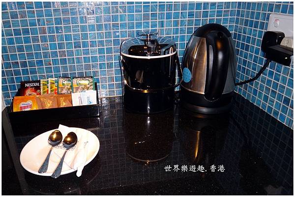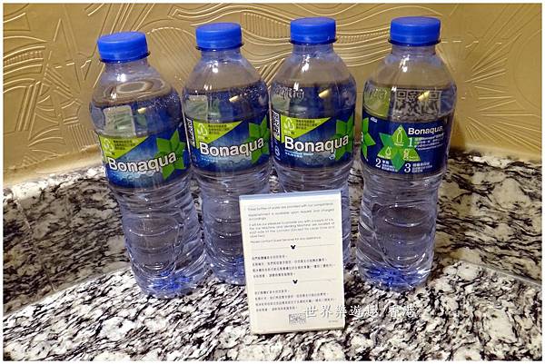 緊鄰電視櫃靠近門口處是一個小吧台,提供了各式茶包、咖啡包,還有熱水壺、馬克杯以及4瓶免費礦泉水放在浴室裡。