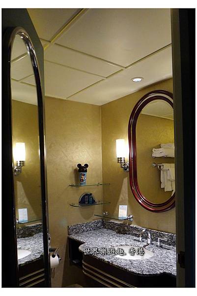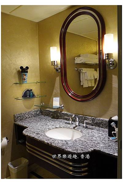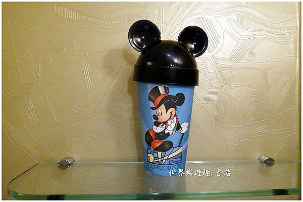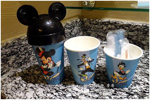 玻璃架上,米奇的杯子帶著米奇的耳朵帽子,隨手打開,備品就放在紙杯裡,漱口紙杯還分大中小3個Size呢!
