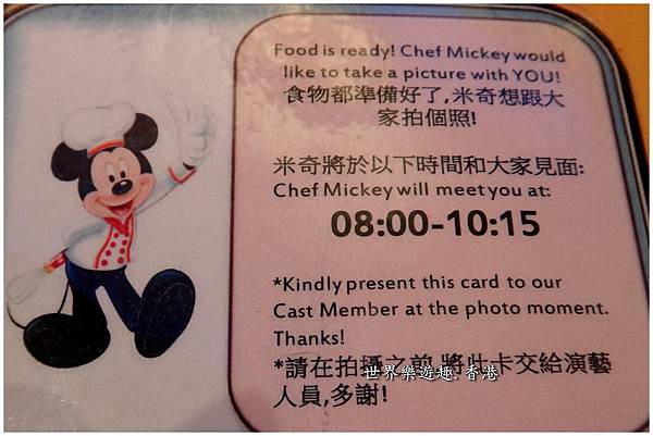 每桌客人都會有張拍照卡,在吃餐的空檔可以和米奇廚師近距離的接觸拍照留念。