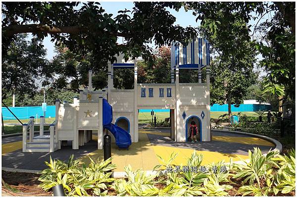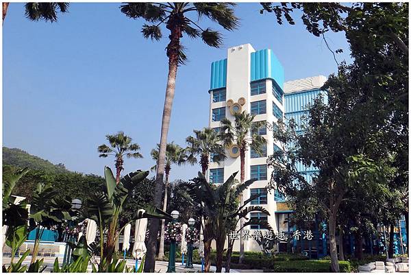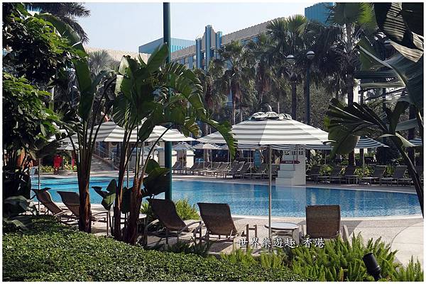 高大的椰子樹旁有清涼的游泳池和兒童最愛的溜滑梯,也是非常的迪士尼,可愛極了!