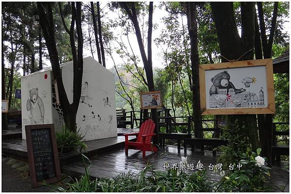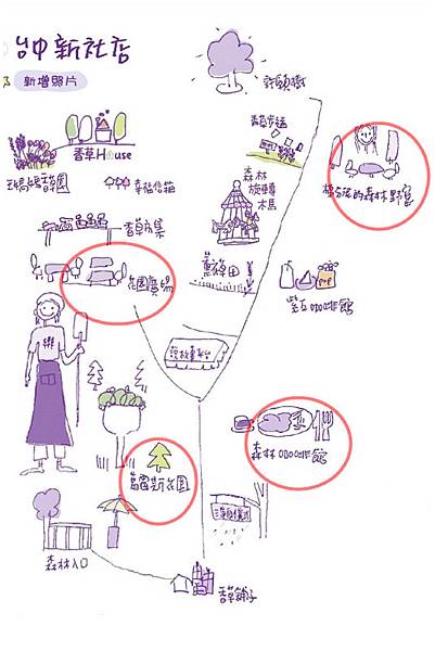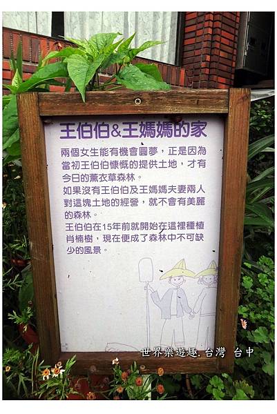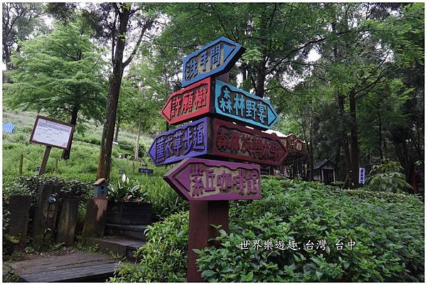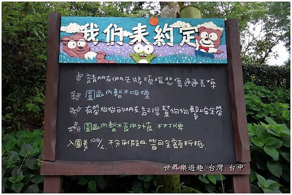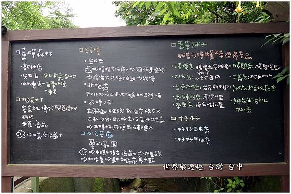 薰衣草森林入口處有一個木頭框成的黑板,上頭寫著薰衣草森林的家族系列。當初就是在尖石薰衣草森林看了這塊版圖,才又相繼走訪明德和新社的薰衣草森林,也才知道原來新社薰衣草森林的香草House是間民宿,可以住宿。