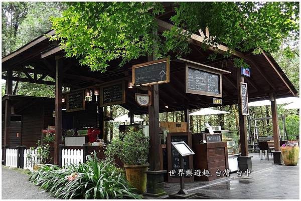 斜坡道右手邊是木造的森林咖啡館,有戶外座位區和室內座位區。