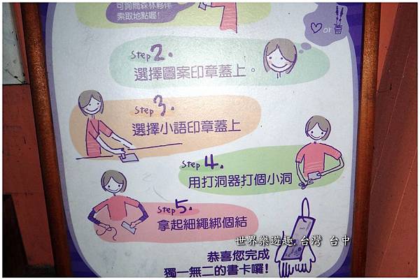 選擇圖案印章蓋在索取的店卡上→再選擇小語印章蓋上→用打洞器打個小洞→拿起細繩綁個結,獨一無二的書卡就完成了。