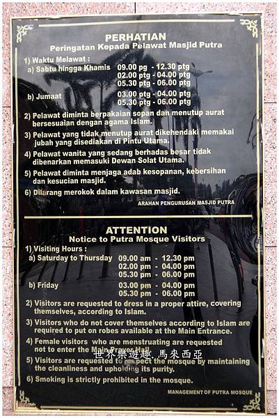 Masjid Putra是馬來西亞少數有對外開放參觀的清真寺,一般開放時間如下,如果遇到特殊日子則依現場規定進出。