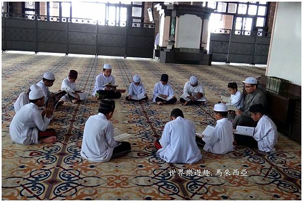 一旁一位穆斯林正教導小朋友讀經,據說戴白帽的是已經去麥加朝聖過的小孩,戴黑帽的則是還沒到過麥加。